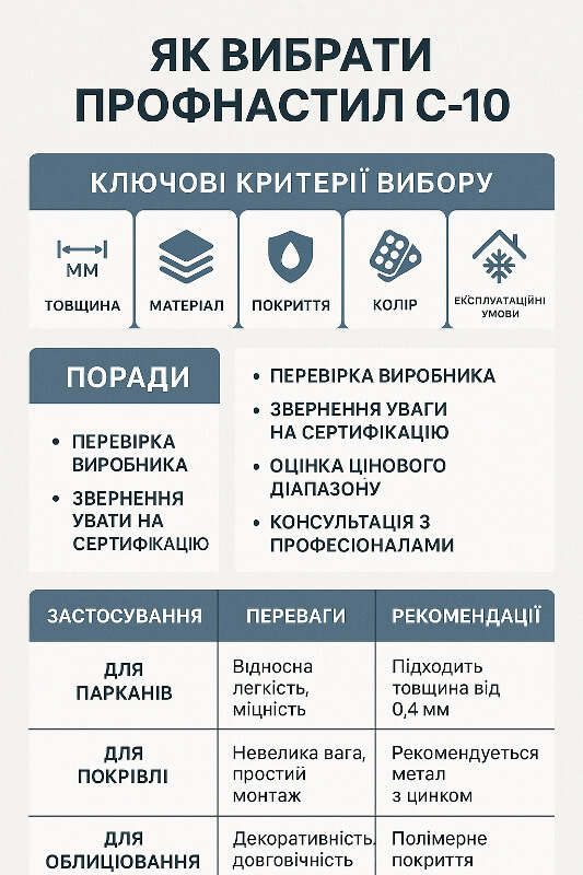 - Покрівля: марки Н, НС (ПК-20, НС-35, Н-60), з висотою хвилі від 20 мм, для скатних дахів. Потрібні снігозатримувачі в снігових регіонах.